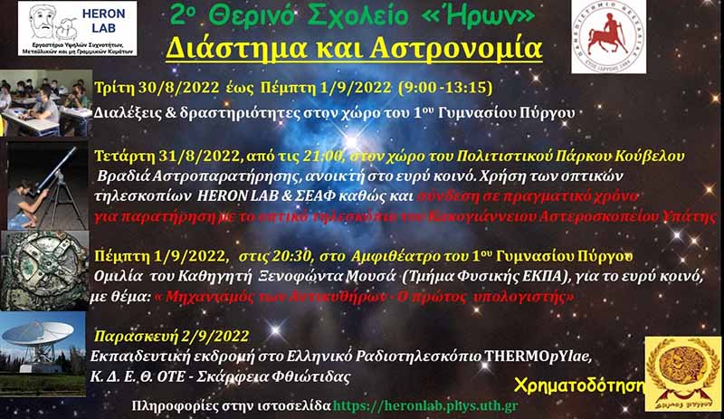 Ξεκινά την Τρίτη 30 Αυγούστου και θα ολοκληρωθεί την Παρασκευή 2 Σεπτεμβρίου το 2ο θερινό σχολείο «ΗΡΩΝ» με θέμα «Διάστημα και Αστρονομία», για μαθητές/μαθήτριες Λυκείου, που συνδιοργανώνεται από το Ερευνητικό Εργαστήριο Υψηλών Συχνοτήτων, Μεταϋλικών και μη Γραμμικών Κυμάτων (HERON LAB) του Τμήματος Φυσικής του Πανεπιστημίου Θεσσαλίας και τον Δήμο Πύργου.