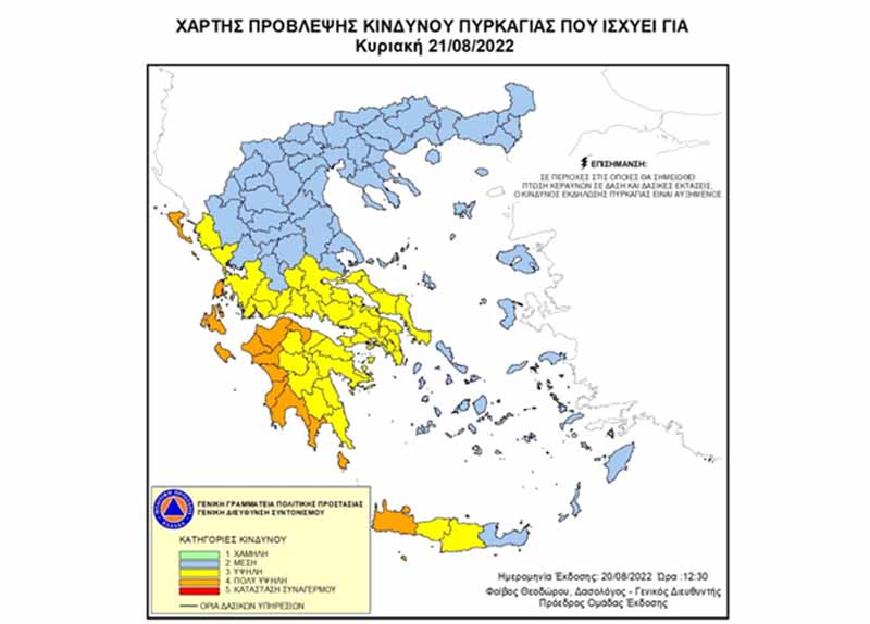 Σύμφωνα με το Χάρτη Πρόβλεψης Κινδύνου Πυρκαγιάς που εκδίδει η Γενική Γραμματεία Πολιτικής Προστασίας του Υπουργείου Κλιματικής Κρίσης & Πολιτικής Προστασίας (www.civilprotection.gr), για αύριο Κυριακή 21 Αυγούστου 2022, προβλέπεται πολύ υψηλός κίνδυνος πυρκαγιάς (κατηγορία κινδύνου 4) για τις εξής περιοχές: