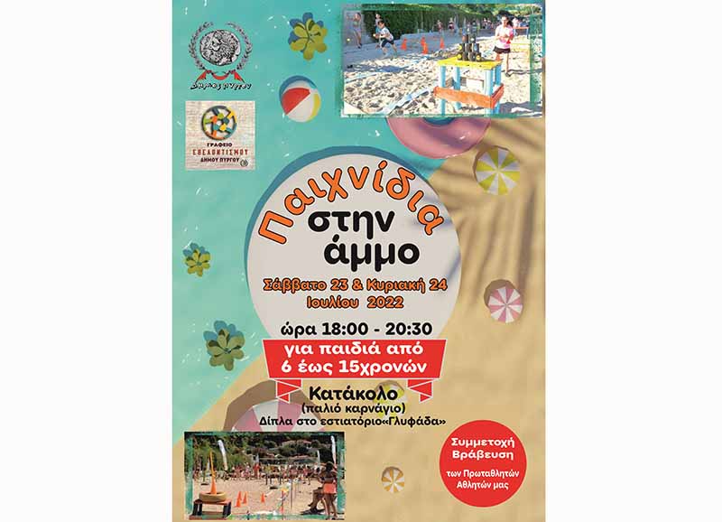 Μετά την πολύ επιτυχημένη περσινή αθλητική εκδήλωση, ο Δήμος Πύργου και το Γραφείο Εθελοντισμού ανανεώνουν και φέτος το ραντεβού τους με τα παιδιά, για «Παιχνίδια στην άμμο-2022» στην παραλία του Κατακόλου.