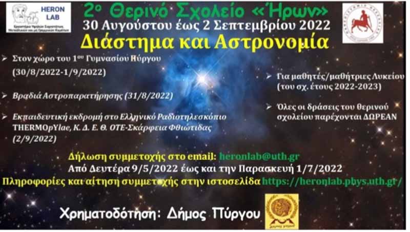 Το 2ο θερινό σχολείο «Ήρων» με θέμα «Διάστημα και Αστρονομία». για μαθητές/μαθήτριες Λυκείου (σχ. έτους 2022-2023) της Περιφερειακής Ενότητας Ηλείας, που συνδιοργανώνεται από το Ερευνητικό Εργαστήριο Υψηλών Συχνοτήτων, Μεταϋλικών και μη Γραμμικών Κυμάτων (HERON LAB) του Τμήματος Φυσικής του Πανεπιστημίου Θεσσαλίας και τον Δήμο Πύργου, θα πραγματοποιηθεί φέτος από 30 Αυγούστου 2022 έως 2 Σεπτεμβρίου 2022.