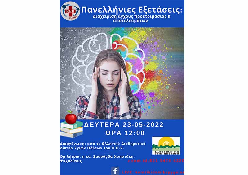 Ο Δήμος Πύργου ως μέλος στο Ελληνικό Διαδημοτικό Δίκτυο Υγιών Πόλεων του Π.Ο.Υ. μετέχει και προσκαλεί για συμμετοχή στη δωρεάν Διαδικτυακή Δράση με θέμα «Πανελλήνιες Εξετάσεις: Διαχείριση άγχους προετοιμασίας & αποτελεσμάτων», που πραγματοποιείται την Δευτέρα 23 Μαΐου