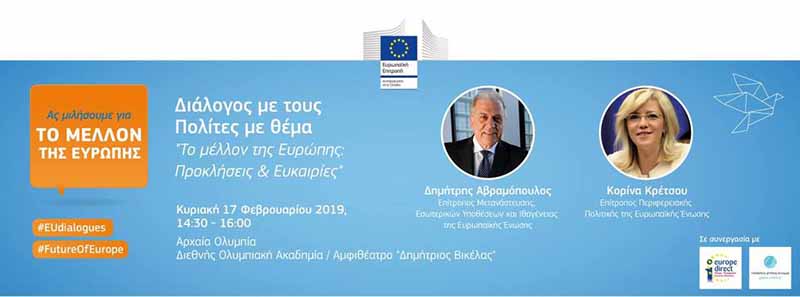 Οι προοπτικές και το μέλλον της Ευρωπαϊκής Ένωσης θα βρεθούν στο επίκεντρο του διαλόγου με τους πολίτες στην εκδήλωση που θα πραγματοποιηθεί την Κυριακή 17 Φεβρουαρίου 2019 και ώρα 14.30 στο Αμφιθέατρο της Διεθνούς Ολυμπιακής Ακαδημίας «Δημήτριος Βικέλας» στην Αρχαία Ολυμπία