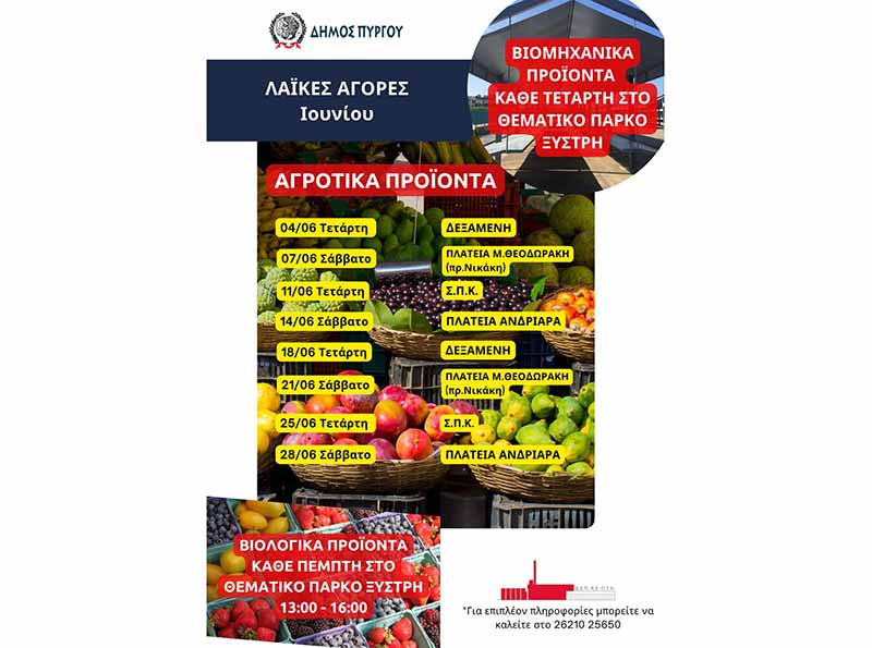 Δήμος Πύργου: Λαϊκές αγορές Ιουνίου