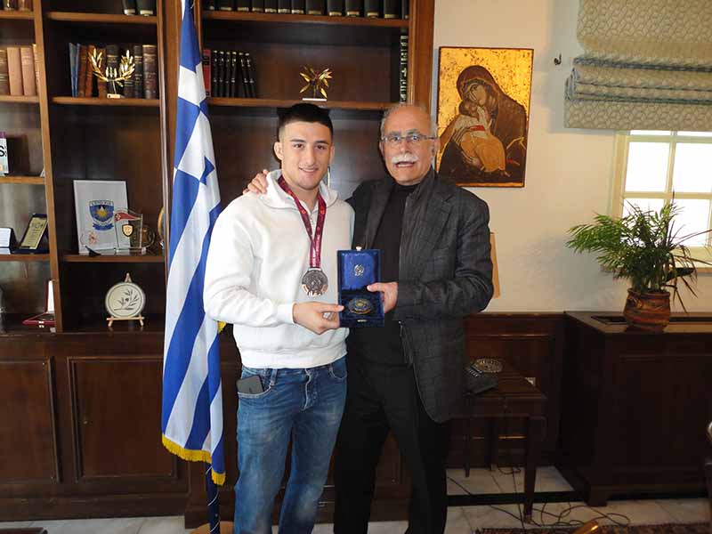 Τον Αρίωνα Κολιτσόπουλο, «χάλκινο» πρωταθλητή της Ελληνορωμαικής Πάλης στο Ευρωπαϊκό πρωτάθλημα U23,που διεξήχθη στα Τίρανα της Αλβανίας, την προηγούμενη Παρασκευή, υποδέχθηκε ο δήμαρχος Πύργου στο Λάτσειο Δημοτικό Μέγαρο. Ο εξ Ηλείας ορμώμενος 18χρονος αθλητής του Π.Σ. «Τιτάν Πύργου» με δύο τεράστιες νίκες επί μεγαλύτερων ηλικιακά άρα και πιο έμπειρων αντιπάλων, ανέβηκε στο βάθρο των νικητών. Επιστρέφοντας στον Πύργο φορώντας το χάλκινο μετάλλιο στο στήθος, συνοδευόμενος από τον πατέρα του και προπονητή του Αλέξιο Κολιτσόπουλο πραγματοποίησε συνάντηση με τον δήμαρχο Στάθη Καννή μετά από πρόσκλησή του δευτέρου.