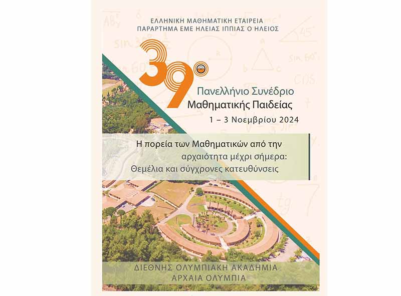 Το 39ο Πανελλήνιο Συνέδριο Μαθηματικής Παιδείας, με θέμα «Η πορεία των Μαθηματικών από τηναρχαιότητα μέχρι σήμερα: Θεμέλια και σύγχρονες κατευθύνσεις», θα λάβει χώρα για πρώτη φορά στον Νομό Ηλείας, στην Αρχαία Ολυμπίαστις εγκαταστάσεις της Διεθνούς Ολυμπιακής Ακαδημίας,από Παρασκευή 1-11-2024 έως και την Κυριακή 3-11-2024.