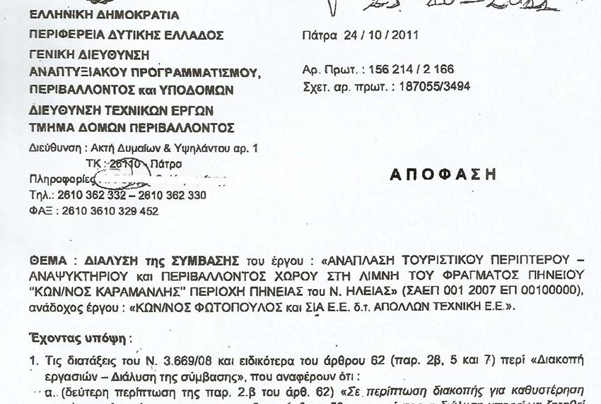Ώσπου στις 24/10/2011, η Δ/νση Αναπτυξιακού Προγραμματισμού Περιβάλλοντος και Υποδομών Περιφέρειας Δυτ. Ελλάδας αποφασίζει (απόφαση με αριθ. πρωτ. 187055/3494), τη διάλυση της σύμβασης του έργου, αποδεχόμενη το σχετικό αίτημα του αναδόχου, διότι δεν είχαν εξοφληθεί ακόμη ο 5ος, 6ος, 7ος και 8ος λογαριασμός του έργου...