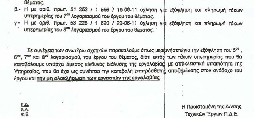 Και μάλιστα, στο ίδιο έγγραφο τονίζεται πως αν δεν πληρωθούν οι λογαριασμοί στον εργολάβο του έργου "...υπάρχει άμεσος κίνδυνος διάλυσης της εργολαβίας, που θα έχει ως συνέπεια την καταβολή επιπρόσθετης αποζημίωσης στον ανάδοχο του έργου και ΤΗΝ ΜΗ ΟΛΟΚΛΗΡΩΣΗ ΤΩΝ ΕΡΓΑΣΙΩΝ ΤΗΣ ΕΡΓΟΛΑΒΙΑΣ".