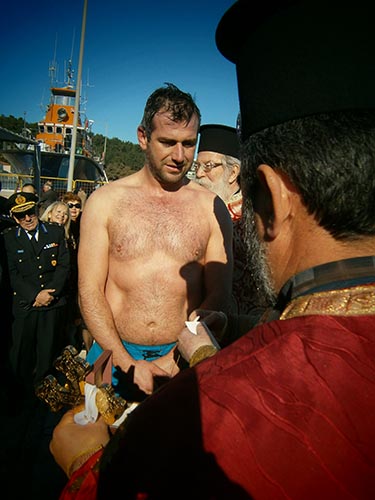 Ο Σεβασμιότατος ευλόγησε, τον 40χρονο Απόστολο Απόστολο Γουργούρα που ανέδυσε τον Σταυρό, αλλά και τους υπόλοιπους εννιά κολυμβητές που βούτηξαν στα παγωμένα νερά.