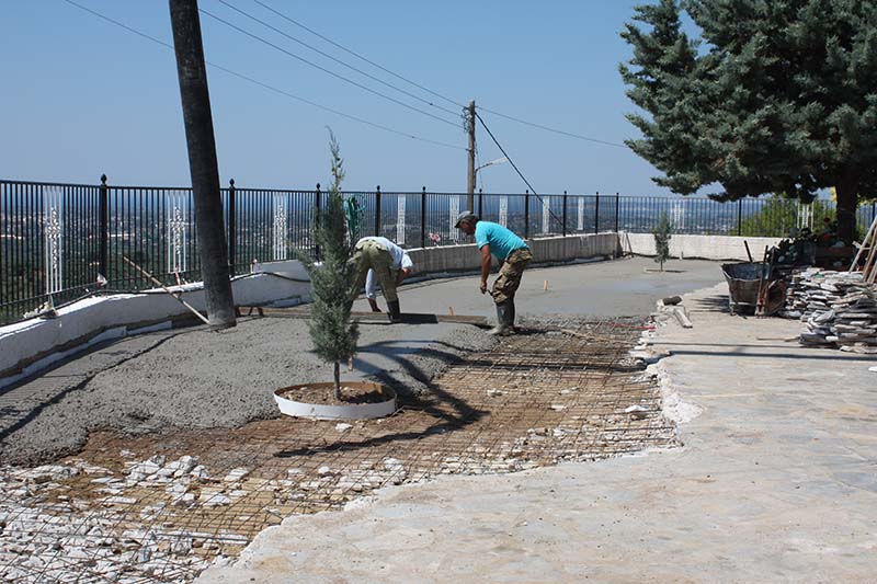μπετονιέρες και τσιμέντο για την αποκατάσταση της καθίζησης στην αυλή του Μοναστηριού.