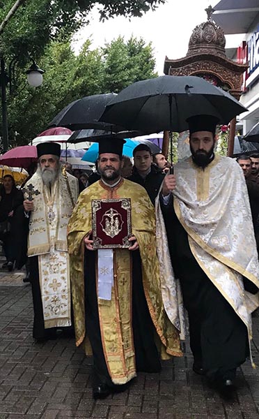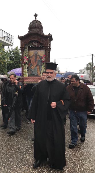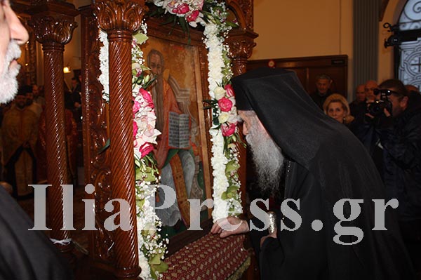 Την Ιερά Εικόνα υποδέχθηκε εντός του Ιερού Ναού της Αγίας Κυριακής, (λόγω των δυσμενών καιρικών συνθηκών), ο Μακαριώτατος Αρχιεπίσκοπος Κύπρου κ.κ. Χρυσόστομος, μετά του Σεπτού μας Ποιμενάρχου κ.κ. Γερμανού, καθώς επίσης και των Θεοφιλεστάτων Επισκόπων Μεσαορίας κ.κ. Γρηγορίου και Ωλένης κ.κ. Αθανασίου, οποίος μετά την συνήθη δέηση ενθρόνισε αυτήν εις τον Ιερό Ναό, όπου και τελέσθηκε Μέγας Αρχιερατικός Πανηγυρικός Εσπερινός μετ’ αρτοκλασιών, ενώ τον Θείον Λόγον κήρυξε επίκαιρα και θεόπνευστα, ο Θεοφιλέστατος Επίσκοπος Ωλένης κ.κ. Αθανάσιος.