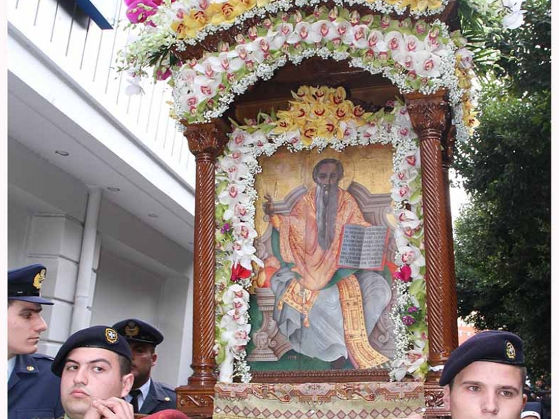 Τον πασίγνωστο και αγαπητό στο Εκκλησιαστικό πλήρωμα της Ορθοδόξου Χριστιανικής Εκκλησίας μας, τον Ιερέα των εκατοδεκατριών ετών, που έλαμψε στον κόσμο με το φρικτό του μαρτύριο για τον Χριστό, σκορπώντας το βαθύ σκοτάδι της ειδωλολατρίας και έτσι αναδείχθηκε «Στύλος ἀκλόνητος, τῆς Ἐκκλησίας Χριστού καί λύχνος ἀείφωτος τῆς Οἰκουμένης». Αξιούμενος πλέον να πρεσβεύει για την σωτηρία των Ορθοδόξων Χριστιανών ανά την Οικουμένη, καθώς επίσης και για τους κατοίκους της πόλης του Πύργου, την οποία πολλές φορές έχει προφυλάξει και έχει διασώσει, παλαιότερα από την φοβερή ασθένεια και επιδημία της πανώλης κατά το έτος 1860, την εκδίωξη της θανατηφόρας επιδημίας της γρίπης το 1918, κατά τον Ιταλικό βομβαρδισμό το 1941, μεταγενέστερα από την φοβερή απειλή των σεισμών της 26ης Μαρτίου 1993, καθώς επίσης και πλείστες άλλες φορές έως σήμερα.