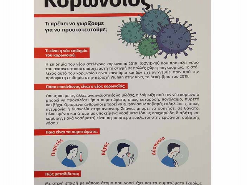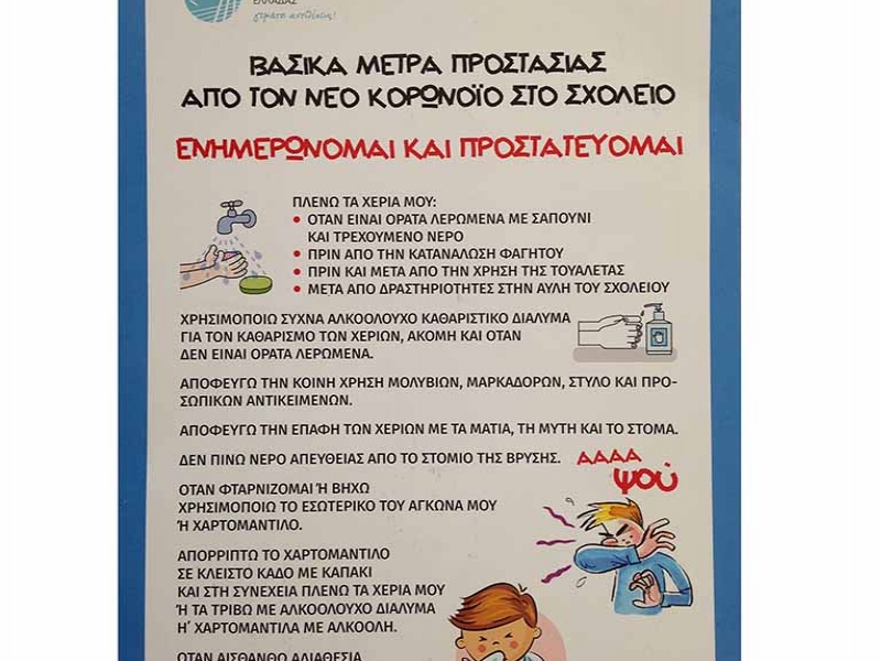 -Στις Διευθύνσεις Πρωτοβάθμιας και Δευτεροβάθμιας Εκπαίδευσης Ν. Ηλείας, με τα βασικά μέτρα προστασίας από τον νέο κορονοϊο στο σχολείο. Με δική τους μέριμνα θα διανεμηθεί σε όλες τις σχολικές μονάδες του νομού.