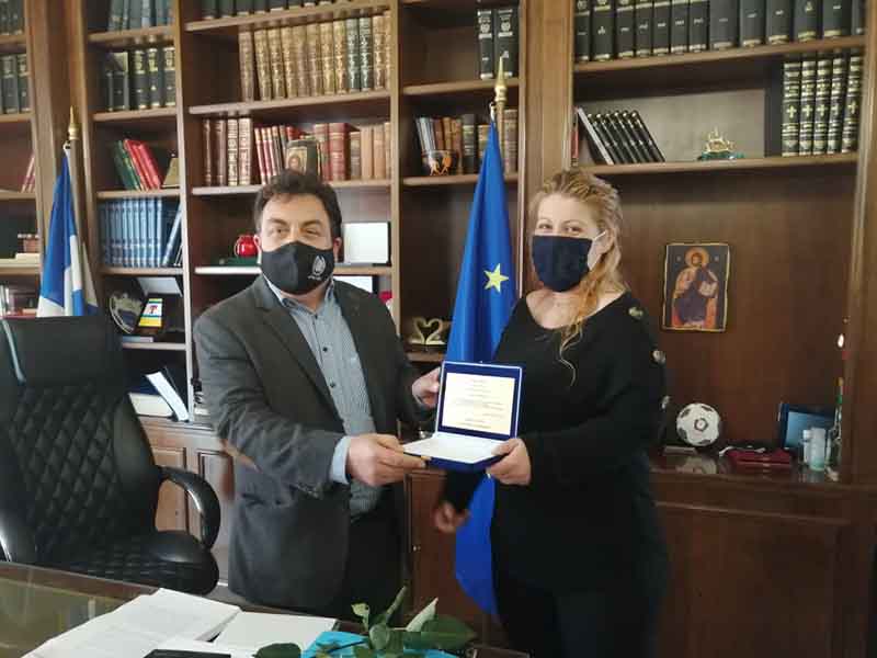 Με μια τιμητική πλακέτα και ένα κόκκινο τριαντάφυλλο ο κ. Αντωνακόπουλος υποδέχτηκε στο γραφείο του την κ. Αναστασίου και την συνεχάρη για τις βραβεύσεις της, με πιο πρόσφατη αυτή από το EUROPEAN SCHOOLNET AKADEMY για την ολοκλήρωση του μαθήματος «Εξερεύνηση λύσεων με βάση τη φύση στην τάξη σας» και θέμα: «Ανακύκλωση – Μάθετε και παίξτε με τα απόβλητά μας (Ένα μικρό… ένα μεγάλο οικολογικό ονειροπόλο)».