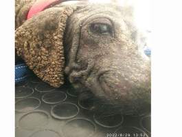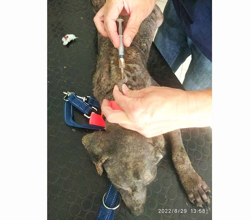 Το σκυλί είναι το πολύ 8 μηνών. Ένα κουτάβι που δεν έχει αλλάξει ακόμη όλα του τα δόντια. Ένα μωρό μου έλιωνε από την σαρκοπτική ψώρα και την πείνα. Ένα μωρό σκυλάκι που κυκλοφορούσε σαν φάντασμα και κανένας δεν του έδινε σημασία . Εκτός από τα δύο μικρά κορίτσια... Υπήρχαν στιγμές που πάνω στο κτηνιατρικό τραπέζι δεν μπορούσε να σταθεί όρθιο. Από την αδυναμία.