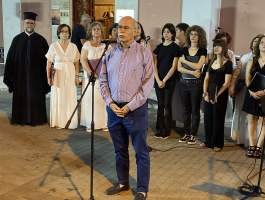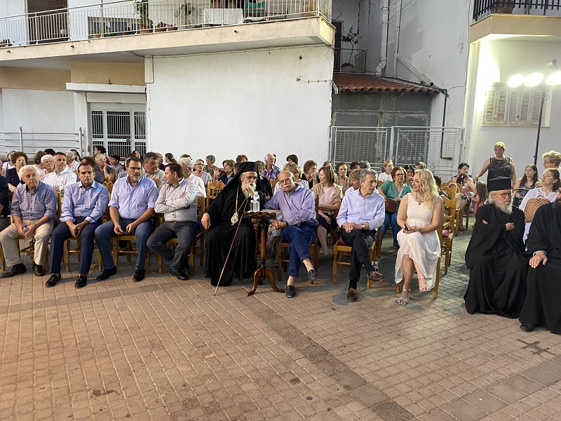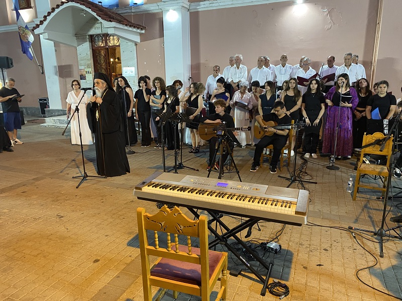 Οι δημότες που βρέθηκαν στον αύλειο χώρο του Ιερού Ναού απόλαυσαν τους Λένα Σουρμελή, Γιάννη Τσικέλη, Γιάννη Σισσαμπέρη, Μαρκέλα Κονδυλάκη, Έλενα Αβραμίκου και την Χορωδία Μυρτουντίων υπό την διεύθυνση του συνθέτη Μιλτιάδη Κασσάρα να ερμηνεύουν τα μελοποιημένα ποιήματα του βραβευμένου από την Ακαδημία Αθηνών, Κωνσταντίνου Σταλιδη.