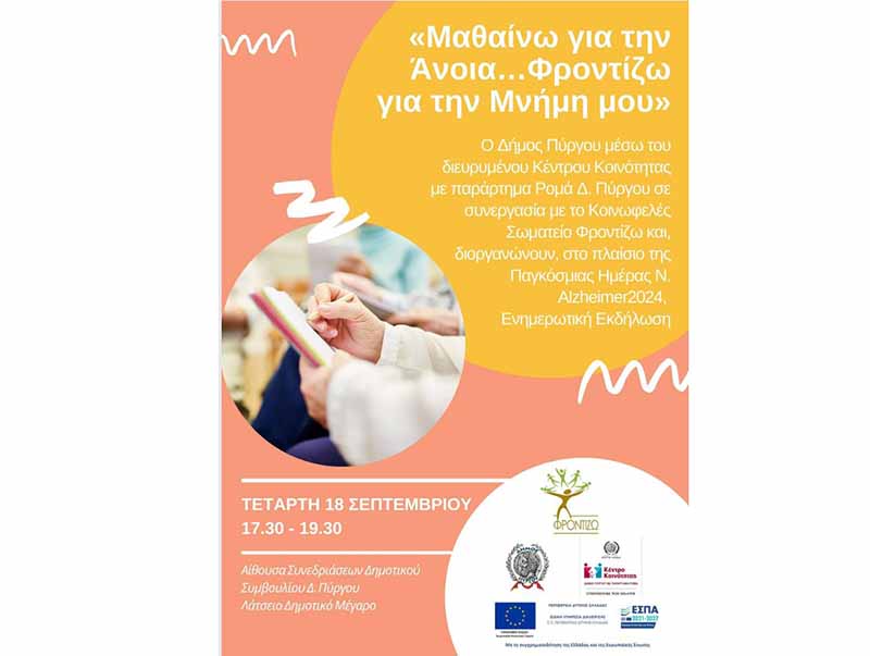 Οι ενδιαφερόμενοιείναι υποχρεωτικό να κλείσουν ραντεβού καλώντας στο τηλέφωνο 2621022199 (ώρες 08:30 – 14:00)Την ίδια μέρακαι ώρες17.30-19.30,στο χώρο συνεδριάσεων Δημοτικού Συμβουλίου Πύργου (πλατεία Σάκη Καράγιωργα ΛΑΤΣΕΙΟ Δημοτικό Μέγαρο), θα διοργανωθείενημερωτική εκδήλωση με τίτλο: «Μαθαίνω για την Άνοια…Φροντίζω για την Μνήμη μου».Σκοπός της εκδήλωσης είναι η ενημέρωση και ευαισθητοποίηση του κοινού για την άνοια και την νόσο Alzheimer