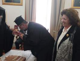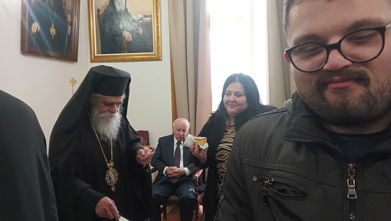 Στο Μητροπολιτικό Μέγαρο παρευρέθηκαν ο Πρωτοσύγκελος της Ι. Μητροπόλεως π. Φιλάρετος Σπανόπουλος, οι σεβαστοί Ιερείς και οι εργαζόμενοι της Ι. Μητροπόλεως, βουλευτές του Νομού μας, οι τοπικοί άρχοντες, εκπρόσωποι των Ενόπλων Δυνάμεων, των σωμάτων ασφαλείας, εκπρόσωποι συλλόγων και πλήθος κόσμου.