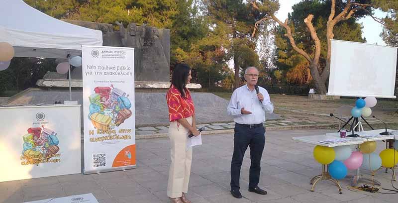 Ο Βασίλης Φάμελλος, Αντιδήμαρχος Περιβάλλοντος, Καθαριότητας – Ανακύκλωσης & Πρασίνου, στον χαιρετισμό του, αφού εξέφρασε τις θερμές του ευχαριστίες προς τους Κώστα Χριστόπουλο και Νικόχρηστο Λαμπαούνα για την δημιουργία του παραμυθιού και του τραγουδιού, αναφέρθηκε στις δράσεις που υλοποιεί ο δήμος Πύργου και έχουν ως σκοπό την προστασία του περιβάλλοντος μέσα από την ανακύκλωση. Επίσης τόνισε ότι το επόμενο διάστημα, μαζί με τους δύο πρωταγωνιστές της δημιουργίας της παιδικής έκδοσης θα επισκεφτούν τα δημοτικά σχολεία του δήμου προκειμένου να διανείμουν το παραμύθι στους μαθητές.