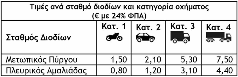Συγκεκριμένα, η σταδιακή λειτουργία του συστήματος χρέωσης αφορά τον μετωπικό σταθμό Πύργου και στις δύο κατευθύνσεις και τον πλευρικό σταθμό Αμαλιάδας με χρέωση από/προς Πύργο.