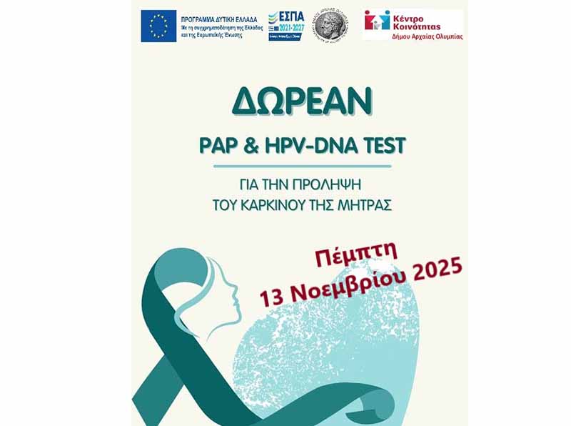 Ο Δήμος Αρχαίας Ολυμπίας, μέσω του Τμήματος Κοινωνικής Προστασίας και του Κέντρου Κοινότητας, σε συνεργασία με το Δίκτυο Πρωτοβάθμιων Υπηρεσιών Υγείας Μαιών της Νοσηλευτικής Μονάδας Αμαλιάδας και το Κέντρο Υγείας Αρχαίας Ολυμπίας, πραγματοποιεί δωρεάν προληπτικό έλεγχο, ΤΕΣΤ ΠΑΠ & HPV DNA TEST σε γυναίκες του Δήμου μας την Πέμπτη 13 Νοεμβρίου.