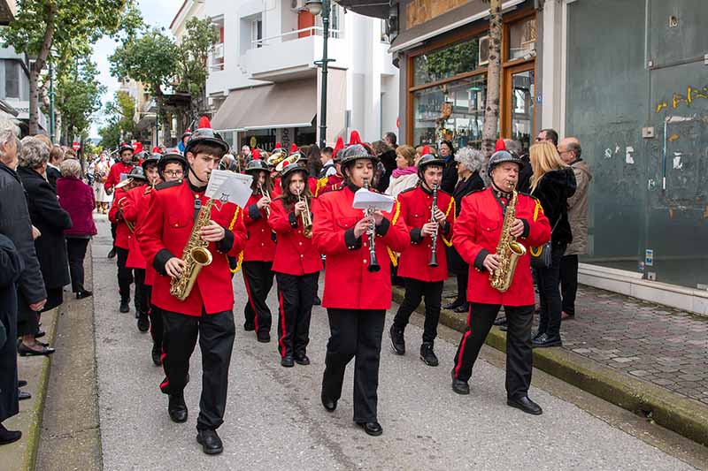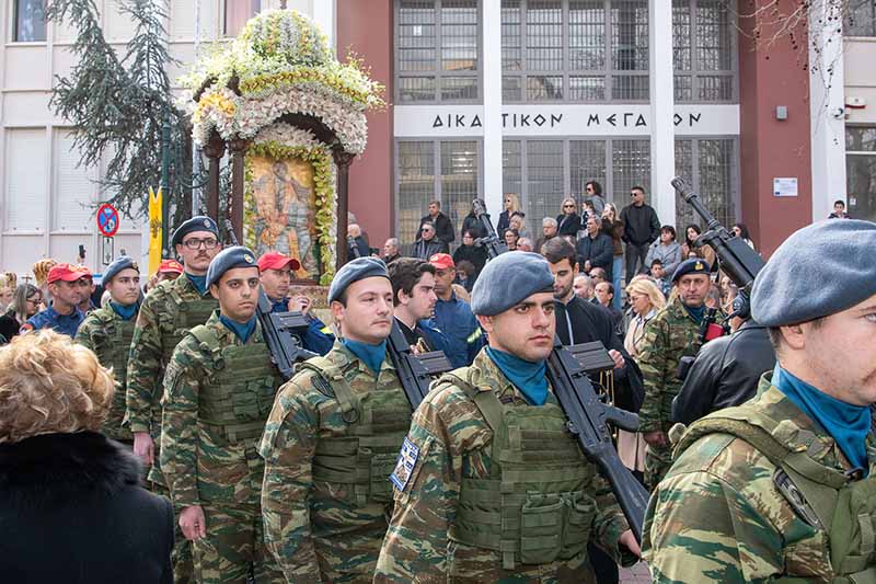 Οι θρησκευτικές εκδηλώσεις κορυφώθηκαν με την καθιερωμένη λιτανεία της ιερής εικόνας του Αγίου στους δρόμους του Πύργου, με τη συμμετοχή στρατιωτικού αγήματος, μαθητών, του Λυκείου Ελληνίδων, του Ερυθρού Σταυρού, των Προσκόπων και του Συλλόγου Φίλων Ιστορίας «Χαράλαμπος Βιλαέτης». Η πομπή πλαισιώθηκε από την μπάντα του Δήμου Ζακύνθου και τη Φιλαρμονική «Απόλλων» Πύργου, που με τα εμβατήριά τους πρόσθεσαν ξεχωριστό χρώμα στη γιορτινή ατμόσφαιρα. Μετά την ολοκλήρωση της λιτανείας, ο Δήμος Πύργου παρέθεσε δεξίωση στο Λάτσειο Δημοτικό Μέγαρο και επίσημο γεύμα σε εστιατόριο της περιοχής προς τιμήν των προσκεκλημένων.