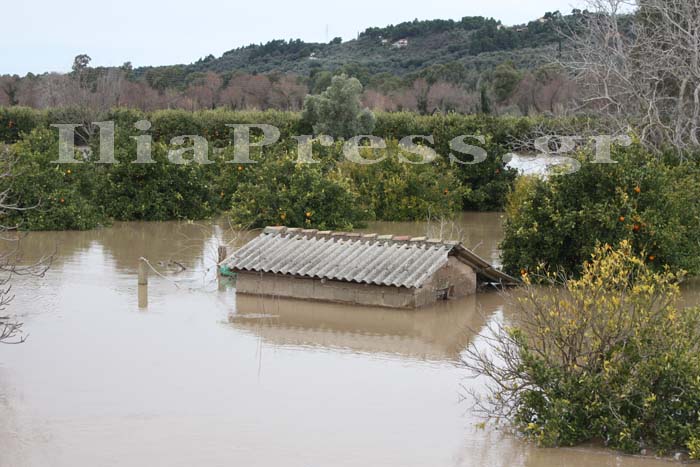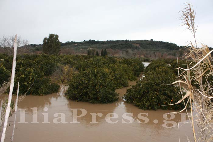 Ήδη, σε ορισμένες περιοχές τα ορμητικά νερά του, «γλύφουν» καλλιέργειες, ενώ άλλες, κυρίως με εσπεριδοειδή και ελιές, έχουν πλημμυρίσει.