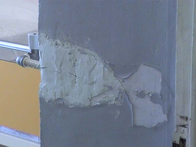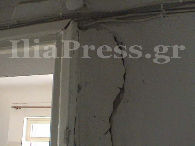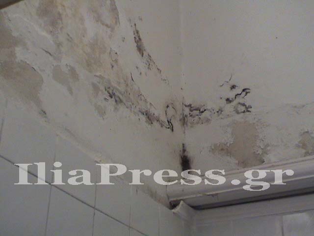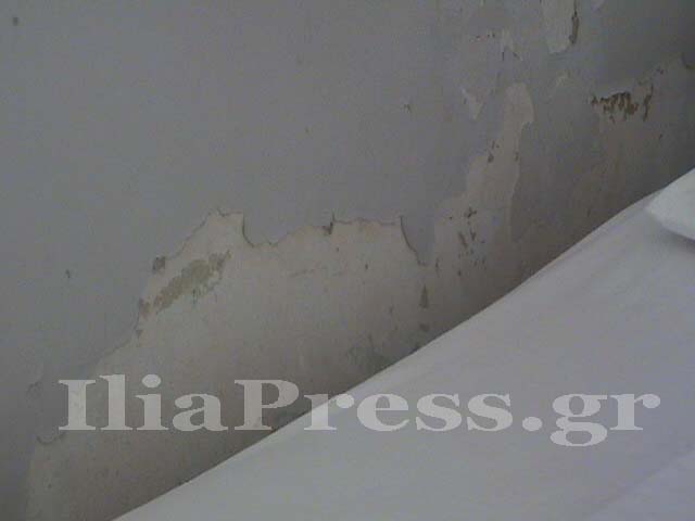 πεσμένοι σοβάδες. Το κτίριο, όπως λέει στην κάμερα του IliaPress ο Διευθυντής, κ. Ευαγγ. Φωτεινόπουλος, δεν έχει ανακαινισθεί από τότε που χτίστηκε, δηλαδή το 1970!