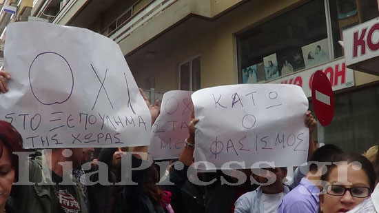 Κατά τη διάρκεια της παρέλασης, αγανακτισμένοι πολίτες, παρακολούθησαν κρατώντας πλακάτ με συνθήματα, όπως: «Όχι στο ξεπούλημα της χώρας μας» και «Κάτω ο φασισμός».