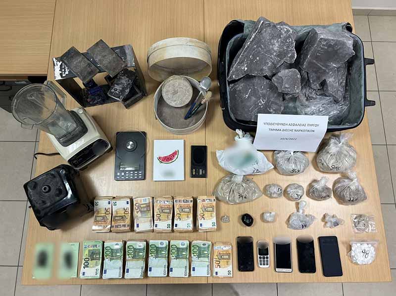 Κατασχέθηκαν περισσότερα από δύο κιλά ηρωίνης, 100 περίπου γραμμάρια κοκαΐνης, πλάκες άγνωστης χημικής σύνθεσης συνολικού βάρους 19 κιλών και ζυγαριές ακριβείας