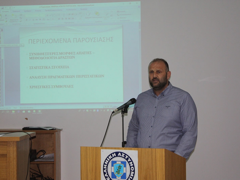 Κατά την ημερίδα, προβλήθηκαν βιντεοσκοπημένες συνεντεύξεις συμπολιτών μας, οι οποίοι ήταν παθόντες σε περιπτώσεις απάτης και μετέφεραν την βιωματική τους εμπειρία στο κοινό, ενώ παρουσιάστηκαν και συνολικά στατιστικά στοιχεία περιστατικών και εξιχνιάσεων για όλη τη Δυτική Ελλάδα.
