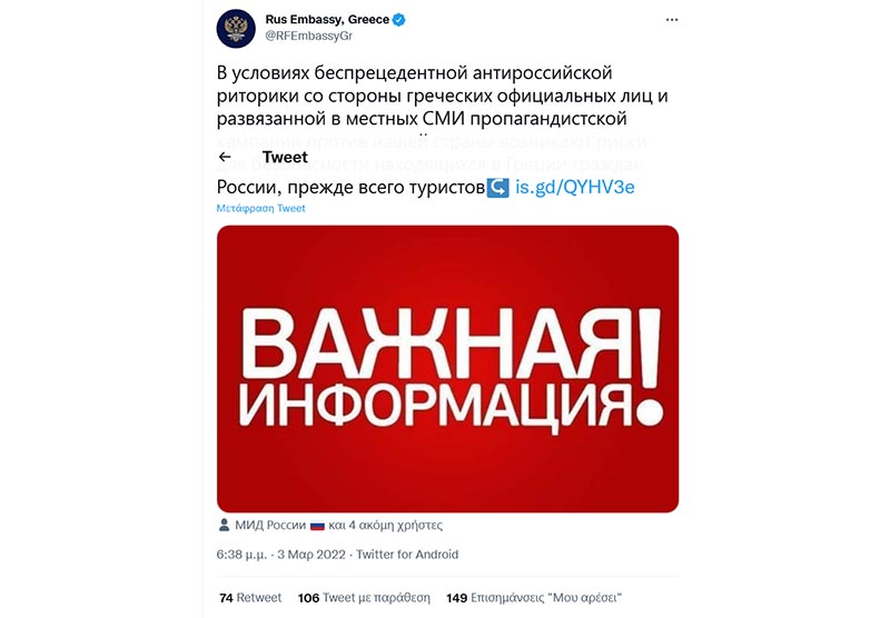 Στα άκρα η Ρωσική διπλωματία κατά της Ελλάδας σημειώνοντας ότι κινδυνεύουν οι Ρώσοι πολίτες και πρωτίστως οι τουρίστες που υπάρχουν στην Ελλάδα. Ειδικότερα σε ανακοίνωση που εξέδωσε η ρωσική πρεσβεία αναφέρει ότι στην χώρα μας υπάρχει «αντιρωσική ρητορική από Έλληνες αξιωματούχους» και καλεί του Ρώσους πολίτες να είναι σε επαγρύπνηση, λαμβάνοντάς μέτρα προφύλαξης και αποφεύγοντας τις άσκοπες μετακινήσεις.