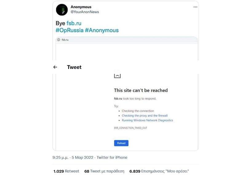 Anonymous: «Έριξαν» τη σελίδα της βασικής υπηρεσίας ασφάλειας της Ρωσίας