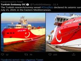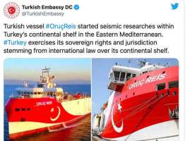 «Το τουρκικό σκάφος Oruç Reis ξεκίνησε σεισμικές έρευνες στην υφαλοκρηπίδα της Τουρκίας στην Ανατολική Μεσόγειο. Η Τουρκία ασκεί τα κυριαρχικά δικαιώματα και τη δικαιοδοσία της στην υφαλοκρηπίδα που απορρέουν από το Διεθνές Δίκαιο.»
