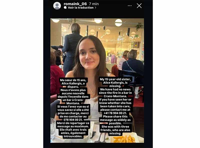 Αγωνία επικρατεί τις τελευταίες ώρες σχετικά με τη λίστα θυμάτων της τραγωδίας στο Κραν Μοντανά, καθώς νεότερες πληροφορίες από την Ελβετία αναφέρουν πως αγνοείται μια 15χρονη Ελληνίδα μόνιμη κάτοικος της περιοχής.