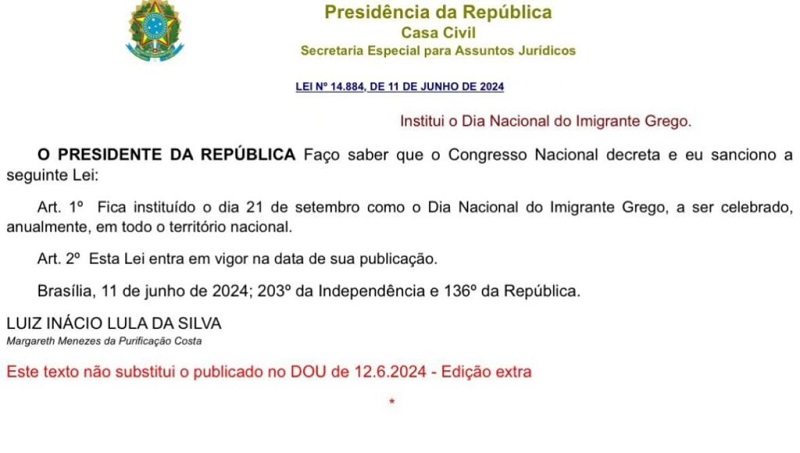 Σύμφωνα με δημοσίευμα του Γενικού Γραμματέα Απόδημου Ελληνισμού και Δημόσιας Διπλωματίας κ. Γιάννη Χρυσουλάκη, ο Πρόεδρος της Βραζιλίας Λουίς Ινάσιο Λούλα ντα Σίλβα, ενέκρινε νόμο που ψηφίστηκε από το Εθνικό Κογκρέσο, με τον οποίο καθιερώνεται η 21η Σεπτεμβρίου ως «Εθνική Ημέρα του Έλληνα Μετανάστη» (Dia Nacional do Imigrante Grego) σε όλη τη χώρα.