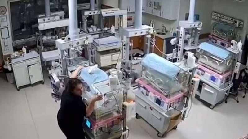 Δύο νοσηλεύτριες στο νοσοκομείο του Γκαζιαντέπ της Τουρκίας σπεύδουν στην αίθουσα που βρίσκονται οι θερμοκοιτίδες με τα νεογνά την ώρα της μεγάλης σεισμικής δόνησης.