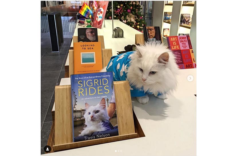 Μια πανέμορφη λευκή νορβηγική γάτα με το όνομα Σίγκριντ απολαμβάνει να κάνει βόλτες στο Λονδίνο στο καλάθι του ποδηλάτου του αφεντικού της, Τράβις Νέλσον, τόσο πολύ που απαιτεί να βγαίνει έξω όποτε βγαίνει κι αυτός για βόλτα.