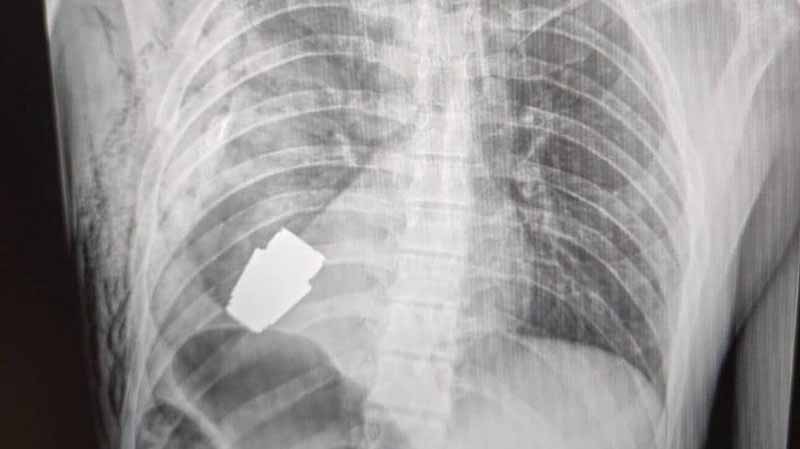 Οι φωτογραφίες που κοινοποιήθηκαν στη σελίδα του Ουκρανικού Στρατιωτικού Ιατρού στο Facebook τη Δευτέρα δείχνουν με την βοήθεια ακτίνων Χ τη χειροβομβίδα στο στήθος του στρατιώτη.