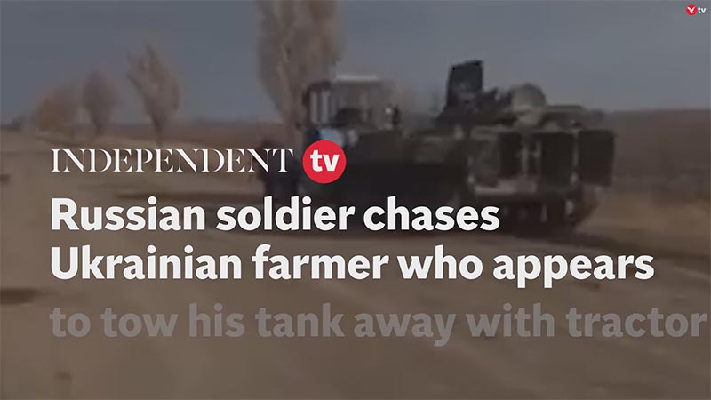 Ρώσος στρατιώτης κυνηγάει Ουκρανό αγρότη που φαίνεται να ρυμουλκεί το τανκ του με τρακτέρ