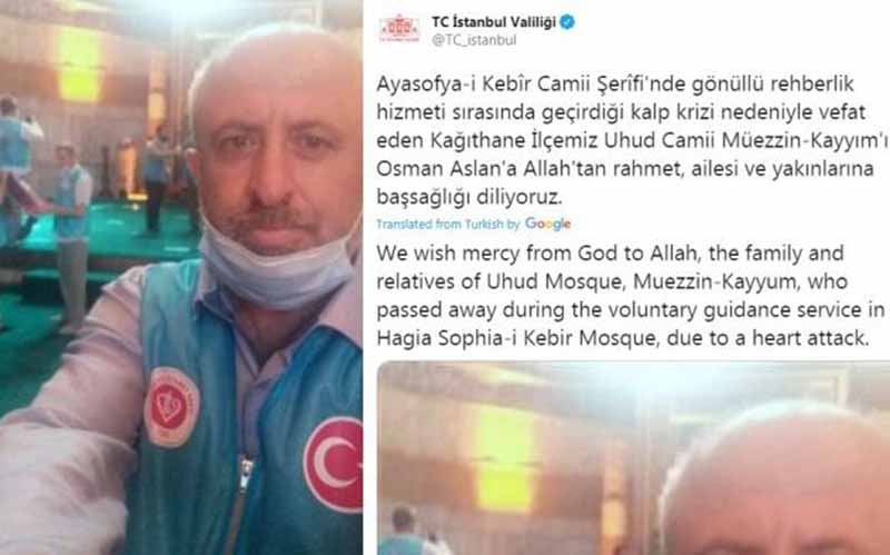 Αίσθηση προκαλεί η είδηση ότι ο μουεζίνης της Αγίας Σοφίας, Οσμάν Ασλάν, πέθανε την Κυριακή ξαφνικά από καρδιακή προσβολή μέσα στην Αγία Σοφία.