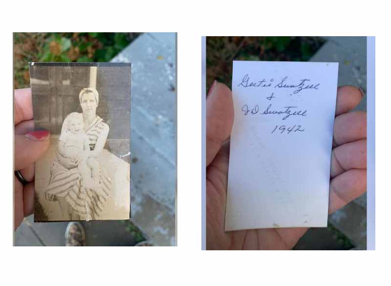 Το στιγμιότυπο, που εικονίζει μια λευκή γυναίκα που φοράει φουστάνι με ρίγες κι έχει ένα μικρό αγόρι στην αγκαλιά, έχει οπισθογραφημένη τη σημείωση «Γκέρτι Σουότσελ + Τζ. Ντ. Σουότσελ, 1942».
