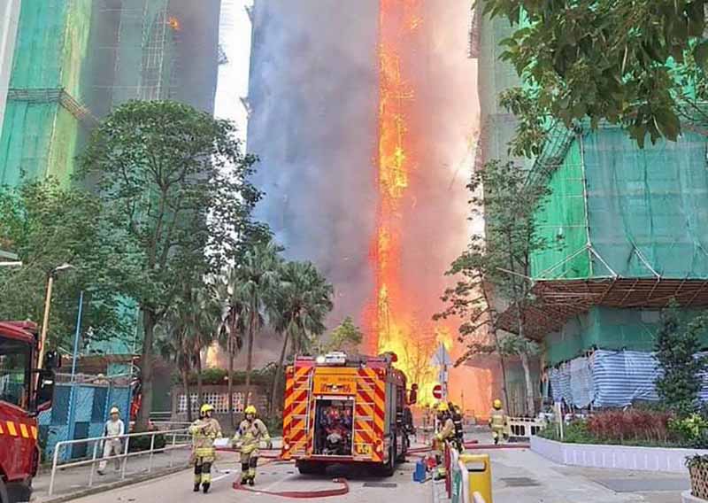 Εργαζόμενοι όλη τη νύχτα, οι πυροσβέστες αγωνίζονταν, λόγω της έντονης ζέστης, να φτάσουν στους επάνω ορόφους του συγκροτήματος κατοικιών Wang Fuk Court, το οποίο διαθέτει 2.000 διαμερίσματα σε οκτώ οικοδομικά τετράγωνα.