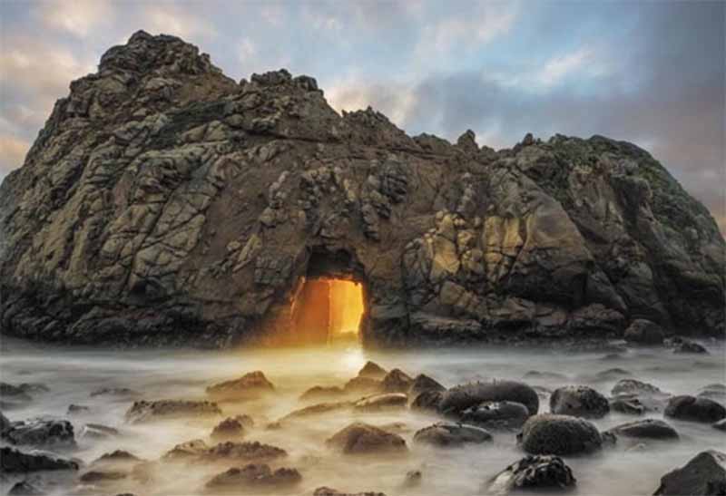 Ένα εκπληκτικό φως που εμφανίζεται στο Keyhole Arch, στην παραλία Pfeiffer της Καλιφόρνια μοιάζει να έρχεται κατευθείαν από ταινία του Ιντιάνα Τζόουνς! Κι όμως δεν πρόκειται για κάποιο εφέ, αφού αυτή η πορτοκαλί λάμψη που βλέπετε είναι ένα φυσικό φαινόμενο που συμβαίνει μόνο για μερικές εβδομάδες κάθε χρόνο, όταν ο ήλιος δύει στη σωστή γωνία και η παλίρροια είναι στο ενδεδειγμένο ύψος.