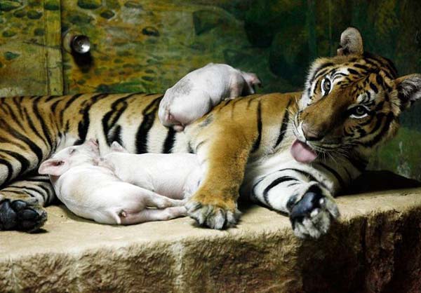 Τρία μικρά γουρουνάκια ξεκουράζονται δίπλα στη θετή μητέρα τους, τη Sai Mai, μια 8χρονη τίγρη, που ζει στο Sriracha Tiger Zoo στην Ταϊλάνδη. “Τα φροντίζει σαν να είναι δικά της και απολαμβάνει το παιχνίδι μαζί τους από την πρώτη κιόλας στιγμή”, λέει ο υπεύθυνος του Ζωολογικού Κήπου.