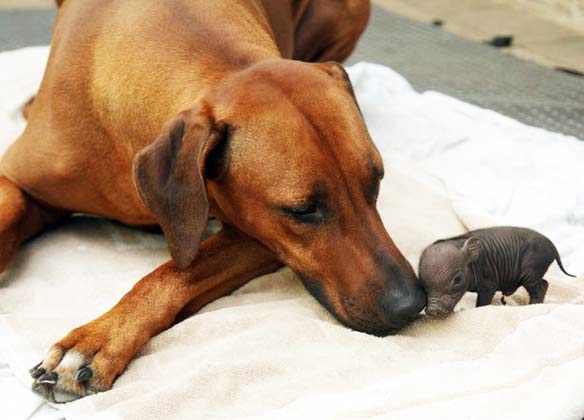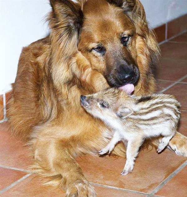 Η Katjinga είναι μια 8χρονη αξιαγάπητη σκύλα που ζει με τους ιδιοκτήτες της σε ένα αγρόκτημα στη Γερμανία, φροντίζοντας εδώ και λίγους μήνες ένα νεογέννητο χοιρίδιο που βρέθηκε ολομόναχο ανάμεσα στα δέντρα του κτήματος. “Η μητέρα του αγνοείται και το βρήκαμε ετοιμοθάνατο. Η Katjinga το πήρε αμέσως υπό την προστασία της!”, λέει ο κ. Roland Adam, υπερήφανος ιδιοκτήτης του σκύλου.