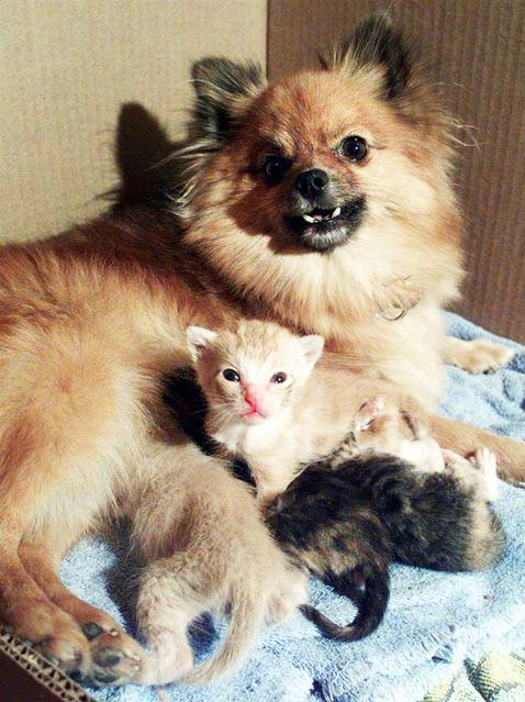 H Chia είναι ένα παιχνιδιάρικο Pomeranian που μόλις είχε γεννήσει τρία κουτάβια. Αν και δύο μηνών “λεχώνα” δεν δίστασε καθόλου να αναλάβει τα ορφανά γατάκια που έφερε στο σπίτι ένας φίλος της οικογένειας.