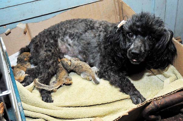 Όταν το δέντρο που ζούσαν αυτά τα τρία μωρά σκιουράκια κόπηκε από τους ξυλοκόπους, η Pixie από τη Νότια Καρολίνα (το μαύρο κανίς που βλέπετε) ήταν εκεί για να βοηθήσει. Έχοντας ακόμη γάλα, μετά τον τοκετό της λίγους μήνες νωρίτερα, η Pixie άρχισε αμέσως να θηλάζει τους σκίουρους χωρίς κανέναν δισταγμό. Τούς ανέθρεψε για 3 εβδομάδες μέχρι να δυναμώσουν, δείχνοντας παράλληλα μεγάλη τρυφερότητα και αγάπη.