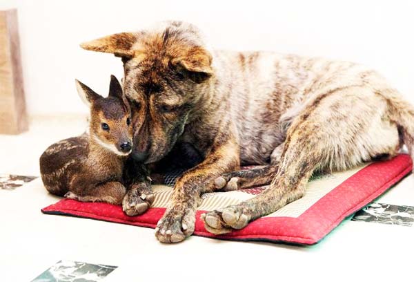 Το μικρό ελαφάκι που βλέπετε ήταν τυχερό για δύο λόγους: Πρώτον γιατί διασώθηκε από τις πλημμύρες ενός ποταμού στη Νότια Κορέα, όταν ένας γεωργός το είδε να παλεύει με τα ορμητικά νερά και δεύτερον επειδή το θηλυκό σκυλί του διασώστη έγινε αμέσως η θετή μητέρα του ελαφιού, θηλάζοντάς το με μεγάλη τρυφερότητα!