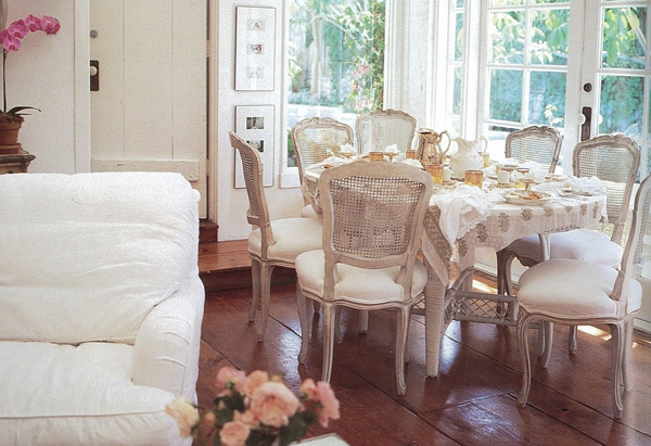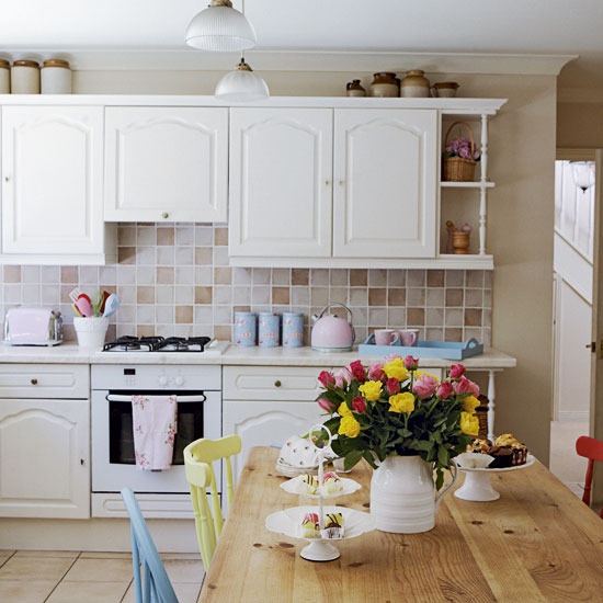 Στο ίδιο πνεύμα και η κουζίνα. Λευκό παντού. Ταβάνια, τοίχοι, έπιπλα, όλα αντανακλούν τον ανοιξιάτικο ήλιο. Πολύχρωμα τραπεζομάντιλα, καλύμματα καρεκλών ή ακόμα και παράταιρες πολύχρωμες καρέκλες διώχνουν την καταχνιά του χειμώνα. Οι διακοσμητές, όπως και το χειμώνα, επιμένουν και στα παράταιρα πιατικά, φλιτζάνια, πιατάκια, κλπ.