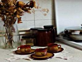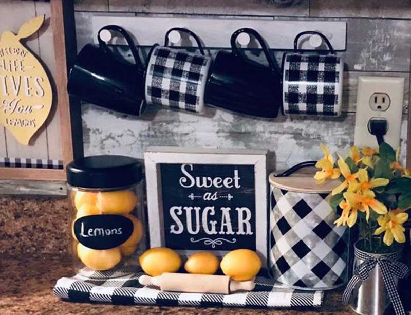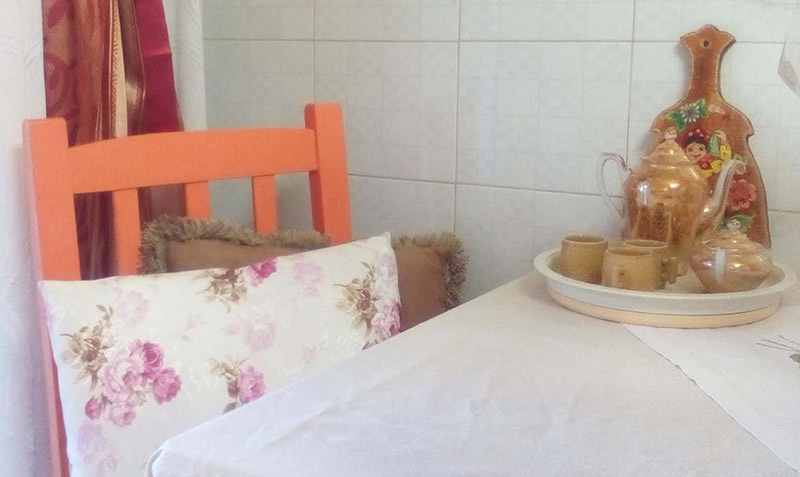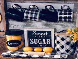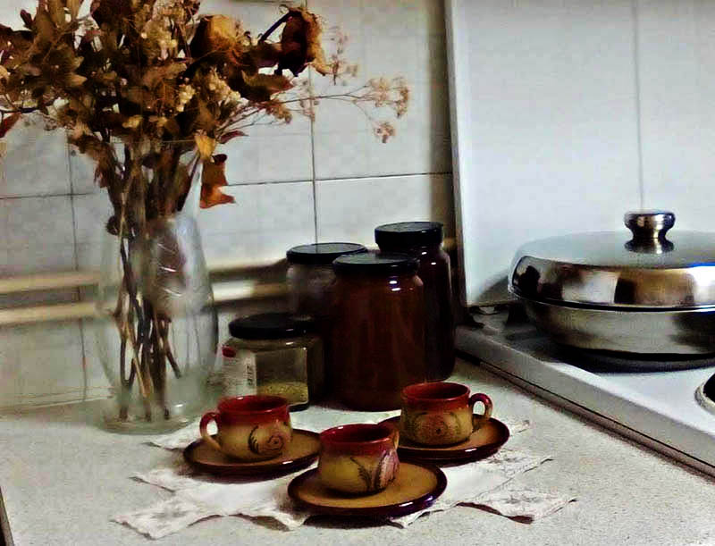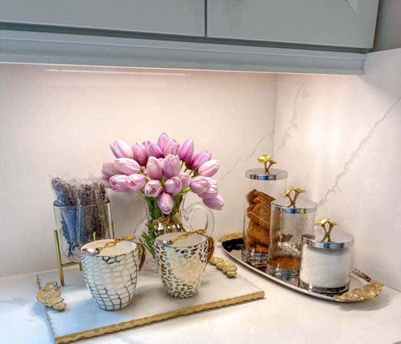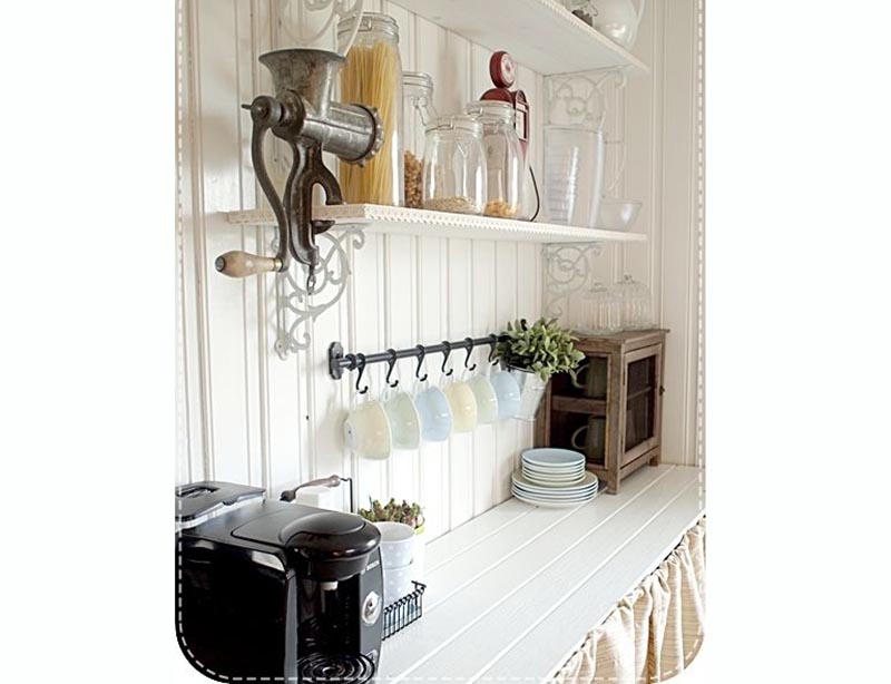 Ένας δίσκος με τα βαζάκια που χρησιμοποιούμε συχνά στον πάγκο, τα ρετρό μας φλιτζανάκια και λουλούδια, φρέσκα ή αποξηραμένα, διακοσμούν μοναδικά τον χώρο.